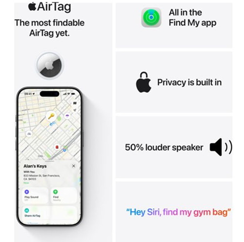 Finding your stuff just got a whole lot easier with the 2nd generation Apple AirTag. Pop one on your keys or slip one in your bag and you’ll be able to track your belongings. Misplaced something at home? Just ping the AirTag from the Find My app or ask Siri. Precision Finding narrows your search by pointing you in the right direction, helping you zero in on your lost item. The boosted speaker means you can hear it from up to twice the distance, so no more ransacking the sofa cushions. Left your bag on the train? The Find My network uses millions of Apple devices around the world to help you track it down. It’s like having your own personal search party.