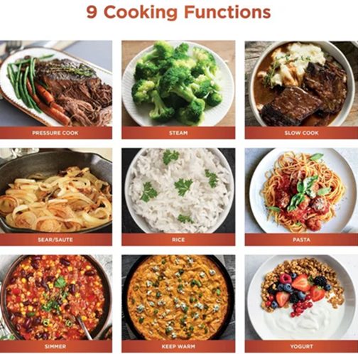 • 9-in-1 functions: Pressure Cook, Steam, Slow Cook, Sear/Sauté, Rice, Pasta, Simmer, Keep Warm & Yoghurt