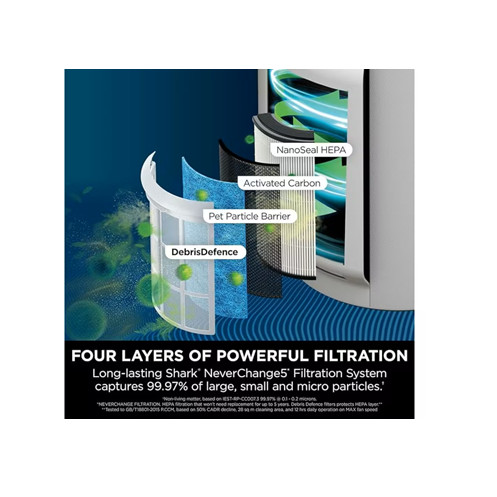 Benefit from 4 layers of powerful filtration: NanoSeal HEPA to capture dust and smoke, Activated Carbon to neutralise odours and gases, a Pet Particle Barrier to guard against dander and allergens, and an easy-to-clean DebrisDefence pre-filter.